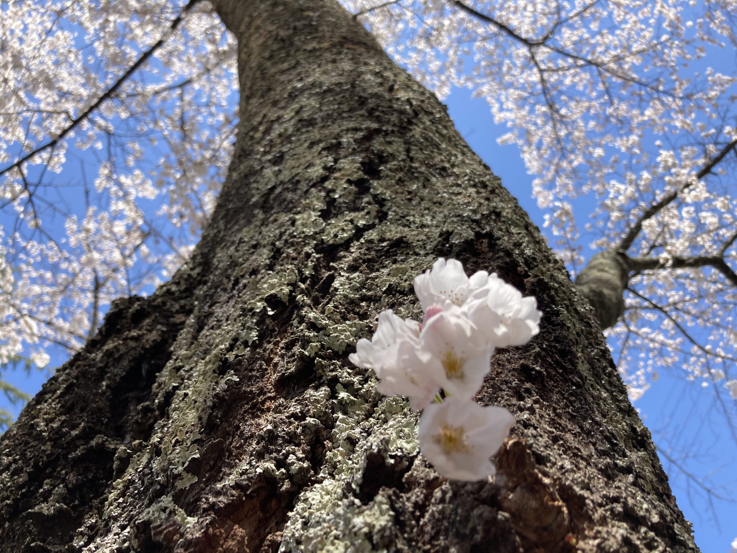 桜の花などの木々の花は私たち人間を楽しませるために私たちの方(下)を向いて咲いています。一方スイセンどなどの地上の花々は私たちの方(上)を向いて咲いていますよね。