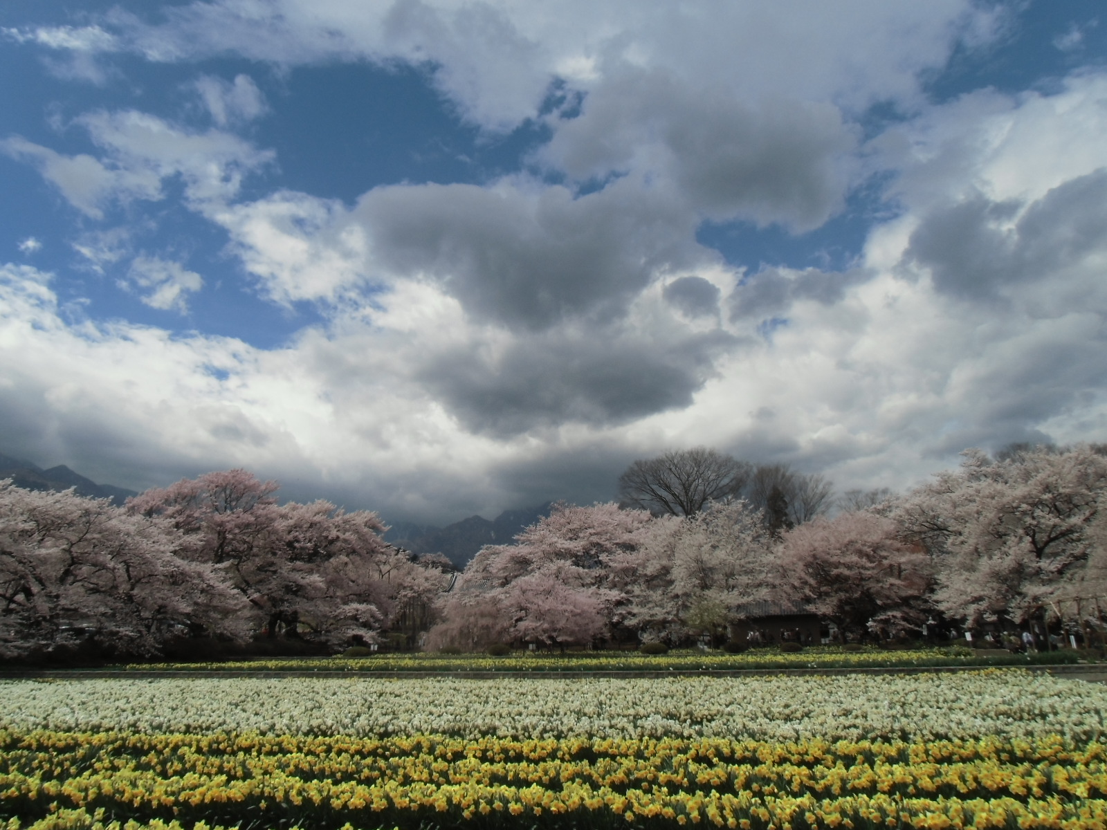 上川の土手の桜並木です。桜とスイセンほぼ同時に咲くのでとても見応えがあります。